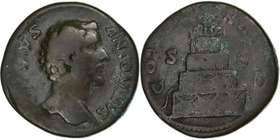 | | Divus Antoninus Pius, Sestertius, 161, Rome, Bronze, , RIC:1266 | | | Head of Antoninus Pius, bare, right, Pyre in four tiers, decorated with swagged hangings an garlands, surmounted by facing quadriga, DIVVS ANTONINVS, CONSECRATIO / S C | | FEATURES |