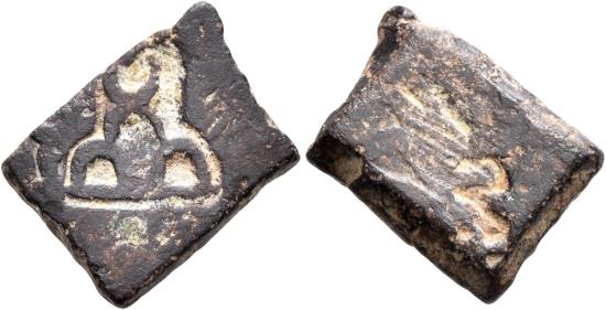 This has the same hill symbol that was seen on the earlier Mauryan punch-marked coinage. After the collapse of the Mauryan empire, this marked a transitional phase where the same symbols appeared on copper coins.