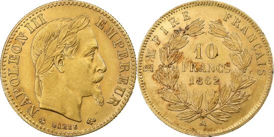 | | France, Napoleon III, 10 Francs, 1862, Paris, Gold, , Gadoury:1014a | | | Laureate head to the right., Value and date within a laurel wreath., Transitional type with small "10". | | FEATURES |