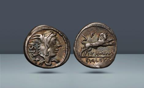 Roman Republic, L. Thorius Balbus. Rome, 105 BC, AR Denarius, 3.79g (20mm, 9h). Head of Juno Sospita r., wearing goat skin; I.S.M.R downwards behind / Bull charging r., F above; below L.THORIVS, in exergue, BALBVS Pedigree: From the estate of Lane Brunner. Purchased from Harlan J. Berk Ltd., c. 1990s References: Crawford 316/1. Sydenham 598. Thoria 1 Grade: Test cut on obverse. Overall light wear. Lovely iridescent toning. Good VF Price: $425 rr1273