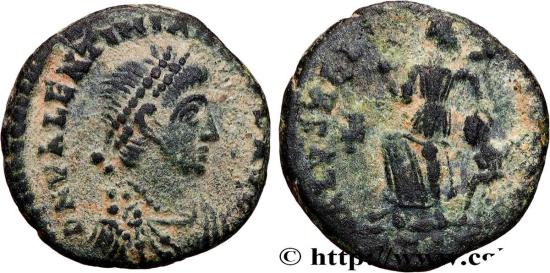 VALENTINIAN II Nummus, (PBQ, Æ 4) 388-392 Atelier incertain copper Obverse : D N VALENTINIANVS P F AVG Buste diadémé, drapé et cuirassé de Valentinien II à droite, vu de trois quarts en avant (Aa) ; diadème perlé Reverse : SALVS REI PVBLICAE/ -|-// [...] Victoria (la Victoire) marchant à gauche, tenant une couronne de la main droite et un captif de la main gauche Commentary : Flan court et légèrement décentré. Joli droit détaillé. Revers plus usé. Patine vert-gris et sable