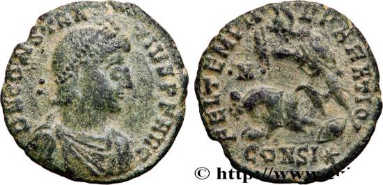 CONSTANTIUS II Augustus Demi-maiorina, (PB, Æ 3) 351-354 Constantinople copper Obverse : D N CONSTAN- TIVS P F AVG Buste diadémé, drapé et cuirassé de Constance II à droite, vu de trois quarts en avant (Aa) ; diadème perlé Reverse : FEL TEMP RE - PARATIO/ .M.//CONSI* Soldat casqué, vêtu militairement, tenant un bouclier sur le bras gauche et une haste de la main droite terrassant un cavalier tombé au sol couché sur son cheval qui est tourné à droite Commentary : Flan bien centré. Usure régulière. Patine verte et sable