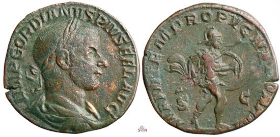 Gordian III Sestertius, struck AD 243 at Rome mint. Obv: IMP GORDIANVS PIVS FEL AVG, laureate, draped and cuirassed bust right. Rev: MARTEM PROPVGNATOREM / S - C, Mars advancing right, holding spear with his right hand and shield in his left. 18,62 g, 29 mm. Cohen 161. RIC 333 |