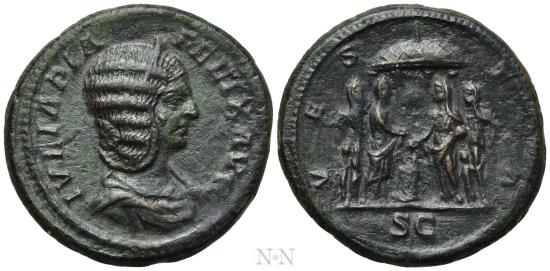 Obv: IVLIA PIA FELIX AVG.Diademed and draped bust right.Rev: VESTA / S C.Four vestal virgins sacrificing over altar in front of the temple of Vesta.