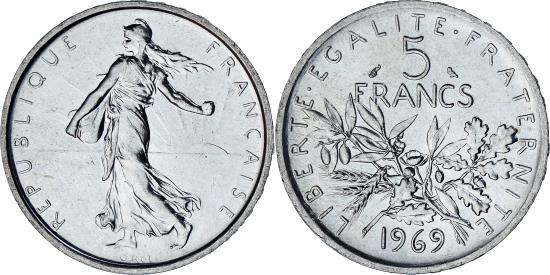 | | France, Semeuse, 5 Francs, 1969, Paris, , Silver, KM:926, Gadoury:770 | | | Semeuse, Figure sowing seed, Branches divide denomination and date | | FEATURES |