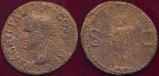 CALIGULA honoring his grandfather AGRIPPA died 12 BC AE AS 30mm 10.5 grams O:M AGRIPPA L F COS III, Agrippa wearing rostral crown facing left R:Neptune standing l. holding a dolphin & trident S-C