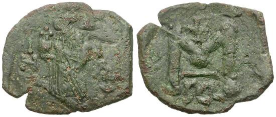 Crowned and bearded emperor standing facing, wearing chlamys and holding globus cruciger, I/N/Δ - I/A (indiction)