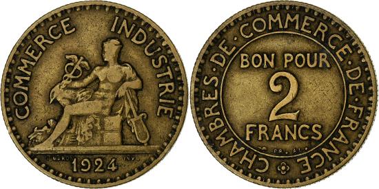 | | France, 2 Francs, Chambre de commerce, 1924, Paris, Aluminum-Bronze, | | | Chambre de commerce, Denomination within circle, Mercury seated left, caduceus at left, shield on right, date below, Without mint mark. | | FEATURES |
