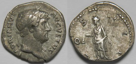 Roman Empire Hadrian AR Denarius (Rome, AD 124-128) HADRIANVS AVGVSTVS, laureate bust right, slight drapery on left shoulder / COS III, Libertas standing left, holding pileus and sceptre. 3.79 grams, 18 mm. Good Very Fine. Light tone. RIC 175, RSC 374a. Purchased from Numismad, Warsaw. |