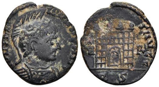 CONSTANTINE I. Ae, Follis. 318-319 AD. Rome mint. Obv/ CONSTANTINVS AVG. Helmeted and cuirassed bust of Constantine I to right. Rev/ VIRTVS AVGG. Campgate with closed doors and four turrets. R-R or H-R across fields; R S in exergue. Cat: NOT IN RIC, var. RIC VII 185. Extremely rare, only known specimen? Bronze (Ae) 2,35g - 19mm. REF: VC164024 |