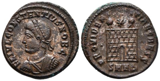 CONSTANTIVS II. Ae, Follis. AD 324-325. Nicomedia mint. Obv/ FL IVL CONSTANTIVS NOB C, laureate, draped and cuirassed bust to left. Rev/ PROVIDENTIAE CAESS, camp gate with no doors and two turrets, star above; SMNΔ in exergue. Cat: RIC VII 94. Bronze (Ae) 3,68g - 19mm. |