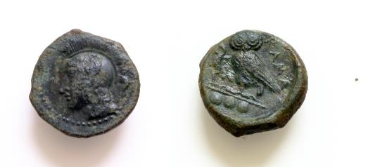 | Sicily, Kamarina, c. 420-410 BC. Æ Tetras 15mm, 3.2g, . Head of Athena l., wearing crested Corinthian helmet. R/ KAMA (retrograde), Owl standing l., grasping lizard. |