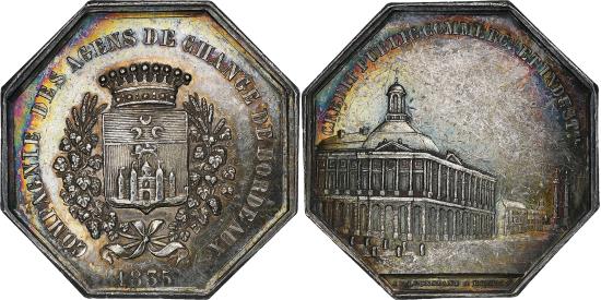 | | France, Token, Compagnie des Agents de Change de Bordeaux, 1835, Silver | | | Crowned shield of Bordeaux within a wreath., Bordeaux stock exchange., Lovely iridescent toning! | | FEATURES |