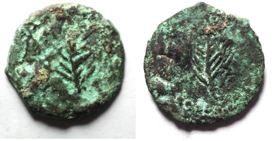 Judaea. AE prutah (14mm, 1.18g). Struck first century AD(?). Palm branch / Palm branch. Apparently unpublished. This remarkable coin features a palm branch on both sides/ Palm branches occur on the prutot of Herod Antipas at Tiberias and of Valerius Gratus and Porcius Festus at Jerusalem, but in different styles.