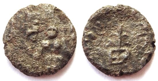 c. 150-100 BC AE coin (1.2 g) Obverse: Goddess Lakshmi standing facing, one hand raised, being lustrated by small elephant to left Reverse: Tree-in-railing with Brahmi legend Agacha janapadasa around Ref: Pieper 1005 The Lakshmi type is the rarest in this series. The kingdom of Agreya or Agrodaka finds mention in ancient Indian texts like the Hindu epic Mahabharata. Mythology associates it with King Agrasena, who is claimed to the progenitor of mercantile communities of North India such as the Agarwals. These rare coins suggest that Agrodaka was the capital of the Agacha people's state. Extremely Rare. |