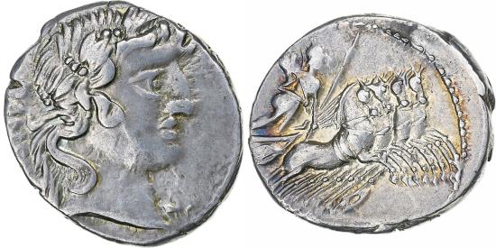 | | Vibia, Denarius, 90 BC, Rome, Silver, , Crawford:342/5 | | | Vibius C. f. Pansa, Laureate head to the right., Quadrige on the right., Very nice golden patina. | | FEATURES |