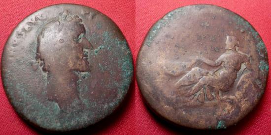 | ANTONINUS PIUS AE sestertius. ANTONINVS AVG PIVS P P TR P COS III, laureate head right. Reverse - TIBERIS S-C, Tiber, crowned with reeds, reclining left, leaning on urn, which pours out water, resting right hand on boat and holding reed. Cohen 819, RCV 4237. Rare. 32mm, 23.1g |