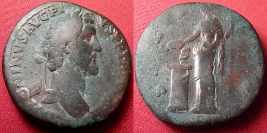 | ANTONINUS PIUS AE sestertius. Rome, 140-144 AD. Salus standing, feeding serpent arising from altar |