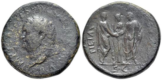 Titus, 79-81 A.D..AE Sestertius (33mm, 23.72g., 6h), Rome Mint, A.D. 80-81. IMP T CAES VESP AVG P M TR P P P COS VIII, laureate head left; R/ PIETAS AVGVST / S C, Titus and Domitian standing facing one another, clasping hands; between them, Concordia standing facing. RARE type. Fine / Near VF, field smooted. |
