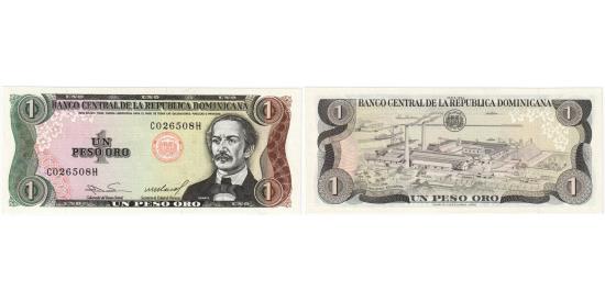 | | Dominican Republic, 1 Peso Oro, KM:126b, UNC(65-70) | | | 1987., New portrait J. P. Duarte at right., Sugar refinery, dates (lightly printed) in upper margin., Black and brown on multicolor underprint. | | FEATURES |