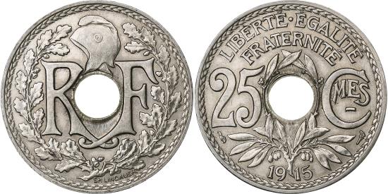 | | France, 25 Centimes, Lindauer, 1915, Nickel, , Gadoury:379, KM:867 | | | Lindauer, Monogram divided by center hole, liberty cap above, wreath surrounds, Center hole and plant divide denomination, dash under MES in denomination | | FEATURES |
