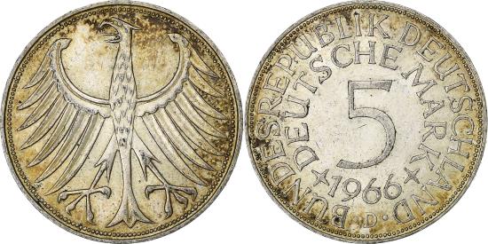 | | GERMANY - FEDERAL REPUBLIC, 5 Mark, 1966, Munich, Silver, , KM:112.1 | | | Denomination above date, Large eagle | | FEATURES |