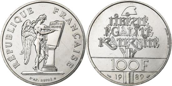 | | France, 100 Francs, Droits de l'Homme, 1989, Silver, , Gadoury:904 | | | Droits de l'Homme, Standing Genius writing the constitution, Liberty cap over inscription above denomination, date below | | FEATURES |