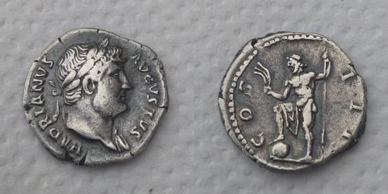 Obv: HADRIANVS AGVSTVS Laureate head right. Rev:COS III Neptune standing left, right foot on globe, holding scepter and acrostolium. BMCRE 354 note. Cohen 313. RIC 159. Stark 162 (4 specimens). Rare type variant with Neptune setting foot on globe,not prow:not in BM by 1976, and only one specimen in the Reka Devnia hoard. Condition: Extremely fine. Weight: 3.25 gr Diameter: 18.5 mm |