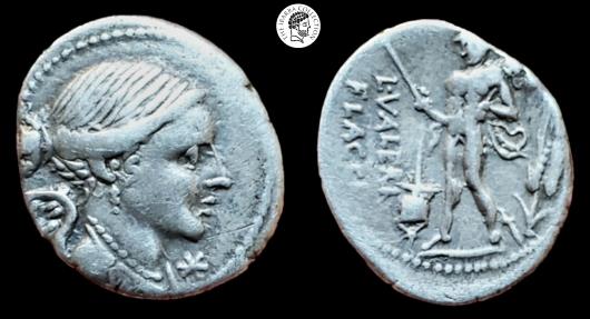 L. Valerius Flaccus. 108-107 BC. AR Denarius. 19mm, 3.71g. Rome mint. Winged and draped bust of Victory right; X (mark of value) below chin / Mars advancing left, holding spear and trophy; apex to left, stalk of grain to right. Crawford 306/1; Sydenham 565. Very Fine. Light scratch on Obv.