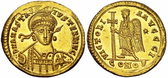 Pseudo-Imperial, uncertain AV Solidus. In the name of Anastasius I. Uncertain mint, AD 491-518. ஃ D N ANASTASIVS TERP AVG, helmeted, pearl-diademed and cuirassed bust facing, holding spear and shield decorated with horseman and fallen enemy motif three dots before the legend and with T instead of P in (TERP) / VICTORIA AVGGG I, Victory standing facing, head to left, holding long jewelled cross; star in right field, CONOB in exergue. Unpublished in the standard references; for another example of similar style, cf. 4.34g, 20mm, 6h. Near Mint State. Apparently unique and unpublished. |