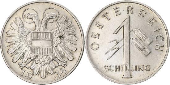 | | Coin, Austria, Schilling, 1934, , Copper-nickel, KM:2851 | | | Two sprigs of grain in center with large numeric value on top, Austrian shield on haloed double eagles breast, tail dividing date | | FEATURES |