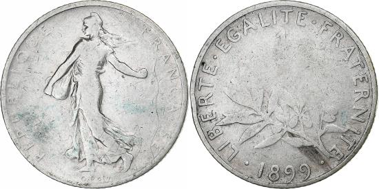 | | France, Franc, Semeuse, 1899, Paris, Silver, , Gadoury:467, KM:844.1 | | | Semeuse, Figure sowing seed, Leafy branch divides date and denomination, Without mint mark. | | FEATURES |
