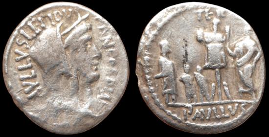 L. Aemilius Lepidus Paullus. AR Denarius 62 BC. PAVLLS LEPIDVS – CONCORDIA Diademed and draped bust of Concordia r. Rev. Trophy; to r., togate figure (L. Aemilius Paullus) and to l., three captives (King Perseus of Macedon and his sons). Above, TER and in exergue, PAVLLVS. Babelon Aemilia 10. Sydenham 926. RBW 1497. Crawford 415/1. 3.37g ; 18 mm |