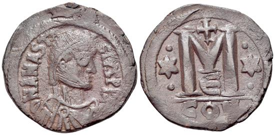 Anastasius I (491-518). Æ 40 Nummi (36mm, 19.80g, 6h). Constantinople, 498-518. Diademed, draped and cuirassed bust r. R/ Large M; cross above, stars with pellets above and below flanking, Є below; CON. MIBE 28b; DOC 23l; Sear 21. VF