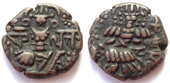Reverse: King standing sacrificing at altar, with Nagari legend