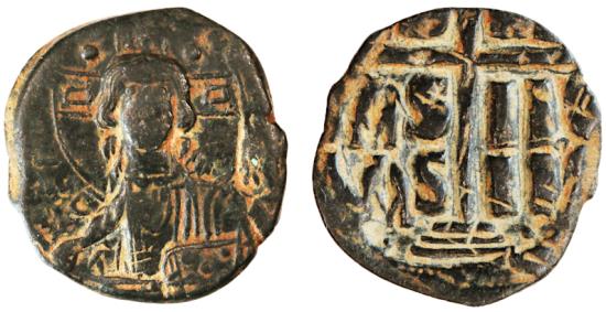 Obverse: Facing bust of Jesus, nimbate, holding book of gospels, inscription around and in fields