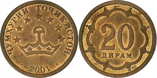 | | Tajikistan, 20 Drams, 2001, St. Petersburg, Brass Clad Steel, , KM:4.2 | | | Crown within 1/2 star border, Large value within design | | FEATURES |