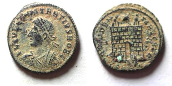 ORIGINAL DESERT PATINA: CONSTANTIUS II AE FOLLIS. CAMP GATE