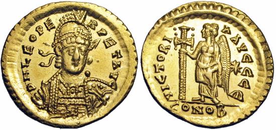 Leo I. AD 457-474. AV Solidus (20mm, 4.45 g, 6h). Constantinople mint, 2nd officina. Struck circa AD 462/6. Pearl-diademed, helmeted, and cuirassed bust facing slightly right, holding spear and shield / Victory standing left, holding long cross; star to right; B//CONOB. RIC X 605; Depeyrot 93/1. Superb EF, |