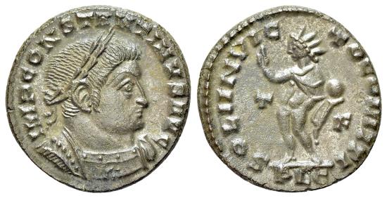 Constantine I (307/310-337). Æ Follis (19mm, 3.45g, 6h). Lugdunum, 314-5. Laureate and cuirassed bust r. R/ Sol standing l., raising r. hand, globe in l.; T-F/PLG. RIC VII 17. EF Ex trésor de Chitry, exemplaire n 1850 |
