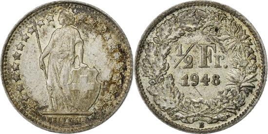 | | Switzerland, 1/2 Franc, 1948, Bern, Silver, , KM:23 | | | Standing Helvetia with lance and shield within star border, Value, date within wreath | | FEATURES |