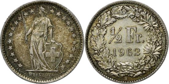 | | Switzerland, 1/2 Franc, 1962, Bern, Silver, , KM:23 | | | Standing Helvetia with lance and shield within star border, Value, date within wreath | | FEATURES |