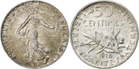 | | France, 50 Centimes, Semeuse, 1918, Paris, Silver, , KM:854 | | | Semeuse, Figure sowing seed, Leafy branch divides date and denomination, Without mint mark. | | FEATURES |