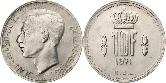 | | Luxembourg, Jean, 10 Francs, 1971, Nickel, , KM:57 | | | Head left, Crown above value and date flanked by leaves | | FEATURES |