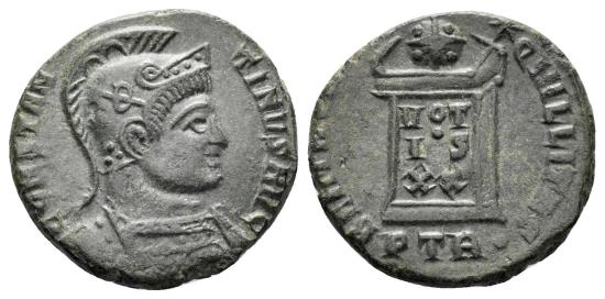 Constantine I 'the Great'. 307-337 AD. AE Follis (2.92g, 17mm). Treveri mint. Struck 321 AD. Obv.: CONSTAN-TINVS AVG, helmeted and cuirassed bust right. Rev.: BEATA TRAN-QVILLITAS, globe set on altar inscribed VOT/IS/XX in three lines; three stars above; PTR• in exergue. RIC 341. gVF.