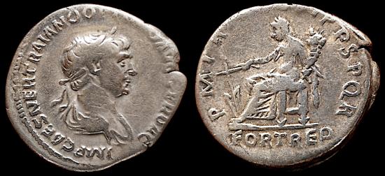 Trajan, 98 – 117 AR Denarius circa 116-117. IMP CAES NER TRAIAN OPTIM AVG GERM DAC Laureate, draped bust r. Rev. PARTHICO P M TR P COS VI P P S P Q R Fortuna seated l., holding rudder and cornucopiae; in exergue, FORT RED.