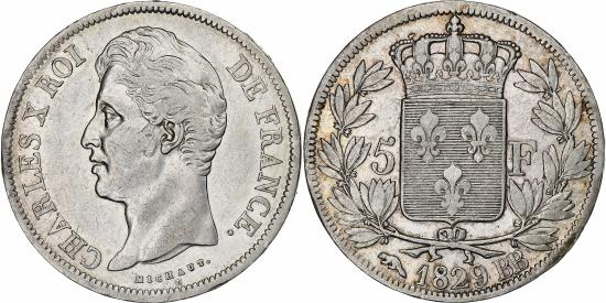 | | France, 5 Francs, Charles X, 1829, Strasbourg, Silver, , Gadoury:644 | | | Charles X, Type II, Crowned arms divide denomination within wreath | | FEATURES |