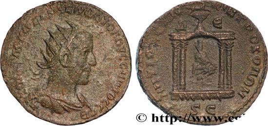 TREBONIANUS GALLUS Sesterce 251-253 Antioche, Syrie, Séleucie et Piérie R1 copper Obverse : Buste radié, drapé et cuirassé de Trébonien Galle à droite, vu de trois quarts en arrière (A*) Reverse : SC Temple tétrastyle avec coupole semi-circulaire ; au milieu, statue de la Tyché d’Antioche assise de face sur un rocher avec l’Oronte nageant à ses pieds ; au-dessus, un bélier bondissant à droite, tournant la tête à gauche Commentary : Monnaie idéalement centrée. Joli revers ainsi qu’un buste agréable. Usure régulière. Patine marron