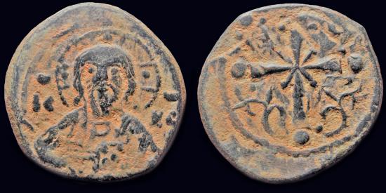 Anonymous Time of Nicephorus III Botaniates(1078-1081AD) AE follis- 6,12 gram- 24 mm, Constantinople mint obv: IC-XC to left ad right of bust of Christ, dotted cross behind head, holding Gospels rev: Latin cross with x in centre, on either side, floral ornament SB 1889 |