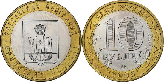 | | Russia, 10 Roubles, 2005, Moscow, Bi-Metallic, , KM:890 | | | Value with latent image in zero within circle and sprigs, Orlovskaya Oblast coat of arms within circle | | FEATURES |